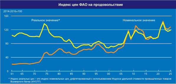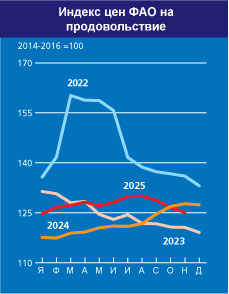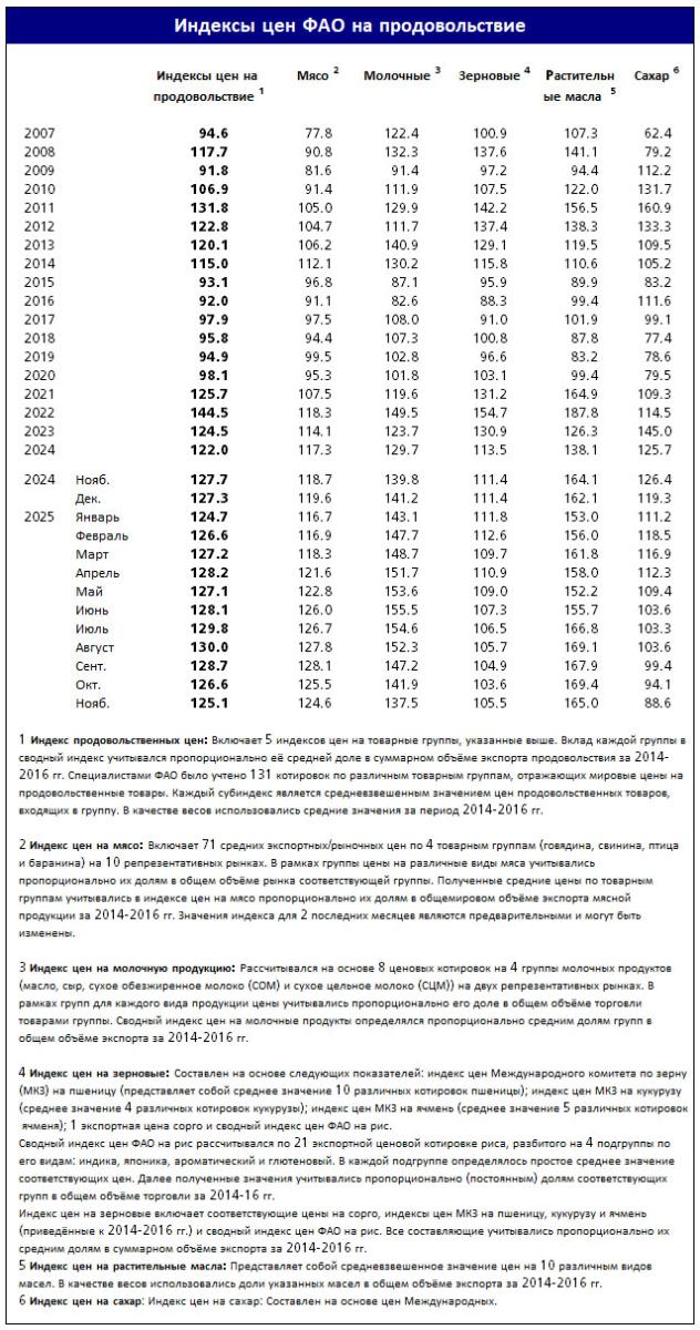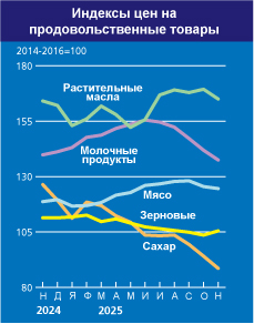 Среднее значение Индекса продовольственных цен ФАО (ИПЦФ) продолжило снижаться третий месяц подряд и в ноябре 2025 года составило 125,1 пункта, что на 1,5 пункта (1,2 процента) ниже пересмотренного октябрьского уровня, когда его значение составляло 126,6 пункта. Снижение индексов цен на молочную продукцию, мясо, сахар и растительные масла позволило компенсировать рост индекса цен на зерновые. В целом значение ИПЦФ оказалось на 2,6 пункта (2,1 процента) ниже показателя ноября 2024 года и все еще на 35,2 пункта (21,9 процента) ниже его рекордного значения, зафиксированного в марте 2022 года. В ноябре среднее значение Индекса цен на сахар ФАО составило 88,6 пункта, что на 5,5 пункта (5,9 процента) ниже октябрьского уровня и на целых 37,9 пункта (29,9 процента) ниже соответствующего уровня прошлого года; таким образом, значение данного индекса снижается третий месяц подряд и второй месяц подряд находится на минимальном уровне с декабря 2020 года. Прогнозы относительно достаточного предложения сахара на мировом рынке в текущем сезоне продолжили оказывать понижательное давление на цены. В ключевых районах выращивания сахарного тростника на юге Бразилии объемы производства сахара сохранялись на высоком уровне, несмотря на сезонное замедление темпов переработки сахарного тростника и уменьшение его использования для производства сахара. Удачное начало сезона сбора урожая сахарного тростника 2025–2026 годов в Индии и благоприятные виды на урожай в Таиланде усилили ожидания обильного мирового предложения сахара и оказали дополнительное понижательное давление на цены. |