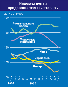 В декабре 2025 года среднее значение Индекса продовольственных цен ФАО (ИПЦФ) составило 124,3 пункта, что на 0,8 пункта (0,6 процента) ниже его ноябрьского показателя: снижение индексов цен на молочную продукцию, мясо и растительные масла с лихвой перекрыло рост индекса цен на зерновые и сахар. Значение индекса оказалось на 3,0 пункта (2,3 процента) ниже соответствующего показателя прошлого года и на целых 35,9 пункта (22,4 процента) ниже его пикового уровня, зафиксированного в марте 2022 года. По итогам 2025 год среднее значение данного индекса составило 127,2 пункта, что на 5,2 пункта (4,3 процента) выше показателей за 2024 год. Среднее значение Индекса цен на сахар ФАО в декабре составило 90,7 пункта, что на 2,1 пункта (2,4 процента) выше его ноябрьского уровня; таким образом, после трех месяцев снижения был зафиксирован рост среднего значения этого индекса, однако оно все еще на 28,6 пункта (24,0 процента) ниже, чем в прошлом году. Зафиксированный в декабре рост был в основном обусловлен резким падением производства сахара в ключевых южных регионах Бразилии, что отразилось на снижении объемов переработки сахарного тростника и его использовании для производства сахара. Сдерживающее воздействие на цены оказала информация о благоприятных видах на урожай и хороших темпах уборочной кампании в Индии, которая позволяет надеяться, что в текущем сезоне в мире предложения сахара сохранится на достаточном уровне. По итогам 2025 года среднее значение Индекса цен на сахар ФАО достигло самого низкого годового значения с 2020 года и составило 104,3 пункта, что на 21,4 пункта (17,0 процента) ниже, чем в 2024 году; основным фактором снижения стало достаточное экспортное предложение. |